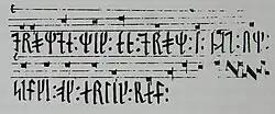 [7] Codex Runicus (AM 28 8vo) is the most famous of several manuscripts from the 13th to 15th centuries containing handwritten copies of the Scanian Law.[8][9] The second part of the Codex Runicus manuscript consists of two short historical texts: a fragment of a list of Danish kings and a chronicle beginning with the legendary Danish king Hadding's son Frode and ending with Eric VI of Denmark. Following the historical texts is a description of the oldest border between Denmark and Sweden and at the last leaf, the notes and words of the oldest preserved piece of music known in Denmark,[10] a verse with accompanying musical notation on a four-line staff – the first musical notations written in Scandinavia.