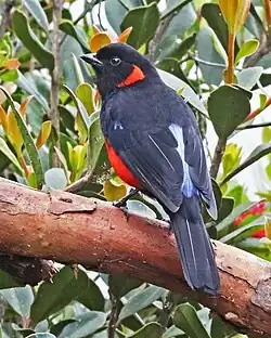 The scarlet-bellied mountain tanager (Anisognathus igniventris) is a species of bird in the family Thraupidae. It is found in Andean forest, woodland and shrub in Bolivia, Colombia, Ecuador, Peru, and Venezuela.[2] It is sometimes split into two species: The scarlet-bellied mountain tanager (A. lunulatus) ranging north from central Peru, and the fire-bellied mountain tanager (A. igniventris) ranging south from central Peru.[1][3] The latter has a lighter, more orangish belly than the former.[2]