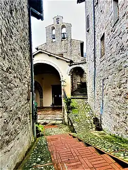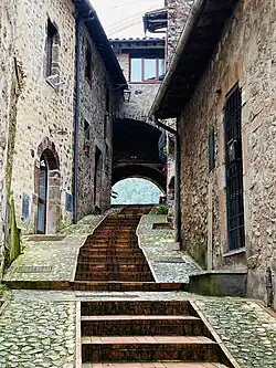 A town of medieval origin with remains of walls and a semi-destroyed donjon from the same period, it was built in the 12th century by the Duchy of Spoleto as a defensive outpost and for this reason was attacked and sacked several times.[6] The 16th century was characterised by a series of struggles between the aristocratic families of the Orsini, supporters of the Guelph Spoleto, and the Colonna, allies of the 23 Ghibelline castle-communes of the Spoleto district.[7] In 1522 Scheggino was besieged by the neighbouring castles, led by Picozzo Brancaleoni and Petrone da Vallo, who took advantage of the absence of the men occupied in the fields to conquer the village, but did not succeed in their undertaking as they were repelled by the women and young people who rushed to defend their homes.[8]