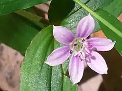 The habitat is moist sites on the forest floor, it grows to 20 cm high. Leaves are hairless, egg-shaped to lanceolate in shape 20 to 50 mm long, 7 to 18 mm wide, with wavy edges.[2] Attractive flowers form in spring. The six petals are pink with purple anthers, flowers around 15 mm across. A wrinkled ovoid capsule forms, 2 to 4 mm wide. Inside are a small number of yellow or brown seeds.