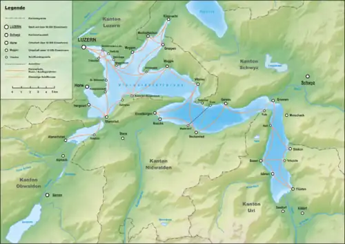 The SGV operates several routes, with many variants, on Lake Lucerne. The following places are served, listed here in clockwise order around the lake shore from Lucerne: