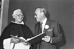 During these years he also studied at the Sorbonne, and in July 1946 he did his doctoral exam at the École des hautes études. In 1952 he defended and published his doctoral thesis at the Dominican school of theology Le Saulchoir: De sacramentele heilseconomie [The redeeming economy of the sacraments].[5] After that, Schillebeeckx became master of the Philosophy Study House of his order in Leuven, and in 1957 he spent one year teaching dogmatics at the Faculty of Theology, Catholic University of Leuven. In 1958 the Catholic University of Nijmegen in the Netherlands made him a professor of dogmatic theology and history of theology.[3] His inaugural lecture Op zoek naar de levende God [In Search of the Living God] introduced Dutch theologians to the nouvelle théologie founded by Chenu, Congar, Hans Urs von Balthasar, and others.[6]
