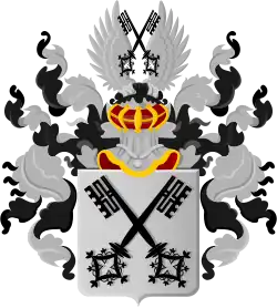 The coat of arms of the family is two crossed, black keys on a silver surface.