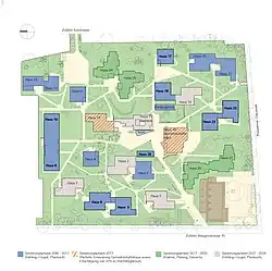 In 2006 the renovation of the buildings began.[9] The renovation of houses 4 and 8 was completed in 2009, and on 19 March 2009, the buildings were returned to the students of the Free University Berlin. The rooms were enlarged, bathrooms were installed and the houses made more energy efficient. Between 2010 and 2011 the renovation of the houses 20 and 21 and the kindergarten in house 15 were carried out. From 2012 to 2013, houses 5, 18 and 6 were renewed by the architects Brenne. In 2014, the renovation of the houses 9, 10, 22 and 23 began, its completion was finished in October 2015. The former library on the village square was renewed in 2014.