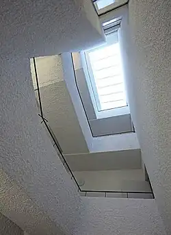The old fruit trees, which Fehling wanted to keep in his planning, were lost. Mattern’s design concept for Studentendorf Schlachtensee is no doubt based on Scharoun's model of the urban landscape. According to the art historian Andreas Butter, this is the "identification of a free, cooperative coexistence of people".[6] According to Butter, in Schlachtensee the naturalistic and non-axial interior design developed by Scharoun has been implemented in an exemplary manner in line with the landscaping of the Enlightenment. "The English park is created, its paths guide so that the visitor has the freedom of choosing how to walk in it."[6] At that time, this concept was primarily used in Sweden and was something entirely new for German landscape design; although the residents of the student village were not only enthusiastic about Mattern`s concept.[7] The strong influence of Sharoun in interior design, but also in the architecture of the community house are not surprising to Butter "since all involved architects were strongly connected to him."[6]