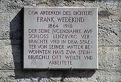 Plaque at the castle commemorating Frank Wedekind, 'who spent his childhood years at Lenzburg Castle and often stayed and worked at the house in which his mother later resided, Zum Steinbrüchli'
