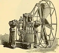 Wheeler invented many electrical devices. He specialized in power saving electrical tools. In 1882 he invented the electric fan by placing a two-bladed propeller on the shaft of an electric motor. It was known as the "buzz fan."[4] He was awarded the John Scott Medal for this invention in 1904 by the Franklin Institute.[4][16] Wheeler's patent for his Electric Fire-engine System was filed May 23, 1882.[1] The United States Patent Office officially approved his invention on February 24, 1885.[17]
