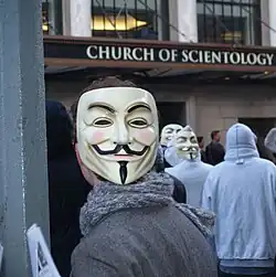 On February 2, 2008, 150 people gathered outside of a Church of Scientology center in Orlando, Florida to hold a protest against the organization's practices.[49][50][51][52] Small protests were also held in Santa Barbara, California,[53] and Manchester, England.[50][54] On February 10, 2008, about 7,000 people protested in more than 93 cities worldwide.[55][56][57] Many protesters wore Guy Fawkes masks inspired by the character V from V for Vendetta, or otherwise disguised their identities, in part to protect themselves from reprisals from the organization.[58][59] Anonymous held a second wave of protests on March 15, 2008, in cities all over the world, including New York, Chicago, Los Angeles, London, Paris, Vancouver, Toronto, Berlin, and Dublin. Anonymous held its third protest against Scientology on April 12, 2008.[60][61] Named "Operation Reconnect", it aimed to increase awareness of the Church of Scientology's disconnection policy.[35] A fourth protest occurred on May 10, 2008, and a fifth (Operation Sea Arrrgh) occurred on June 14, 2008.