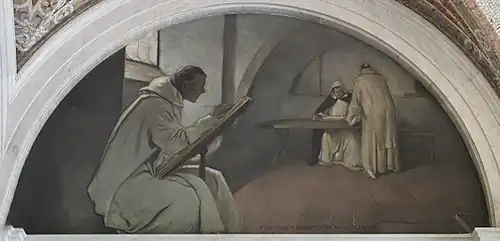 The Rule of Saint Benedict does explicitly call for monks to have ready access to books during two hours of compulsory daily reading and during Lent, when each monk is to read a book in its entirety.[31] Thus each monastery was to have its own extensive collection of books, to be housed either in armarium (book chests) or a more traditional library. However, because the only way to obtain a large quantity of books in the Middle Ages was to copy them, in practice this meant that the monastery had to have a way to transcribe texts in other collections.[32] An alternative translation of Benedict's strict guidelines for the oratory as a place for silent, reverent prayer actually hints at the existence of a scriptorium. In Chapter 52 of his Rule, Benedict's warns: "Let the oratory be what it is called, and let nothing else be done or stored there".[33] But condatur translates both as stored and to compose or write, thus leaving the question of Benedict's intentions for manuscript production ambiguous.[34] The earliest commentaries on the Rule of Saint Benedict describe the labor of transcription as the common occupation of the community, so it is also possible that Benedict failed to mention the scriptorium by name because of the integral role it played within the monastery.