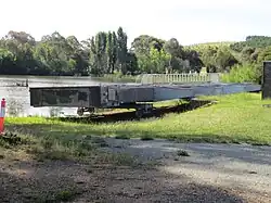 The dam wall provides a crossing for the lake and consists of a roadway, called Lady Denman Drive, and a bicycle path.[5] The roadway was possible because the dam gates are closed by pushing up from below, unlike most previous designs that wherein the gates were lifted from above.[6]