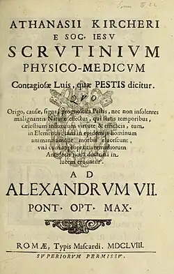 Scrutinium Physico-Medicum Contagiosae Luis, Quae Pestis Dicitur (A Physico-Medical Examination of the Contagious Pestilence Called the Plague) is a 1658 work by the Jesuit scholar Athanasius Kircher, containing his observations and theories about the bubonic plague that struck Rome in the summer of 1656. Kircher was the first person to view infected blood through a microscope, and his observations are described in the book.[1] The work was printed on the presses of Vitale Mascardi and dedicated to Pope Alexander VII.[2][3]: xxxiv