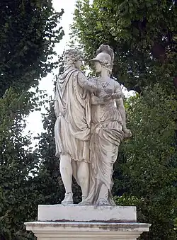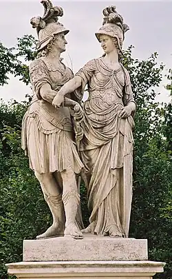 | 15 | Paris | Veit Königer | Paris was the son of Priam, king of Troy, and his wife Hecuba.[25] He appears in several Greek legends and in Virgil's epic poem Aeneid. Sent by his father as an ambassador to Sparta, Paris fell in love and eloped with Helen, queen of Sparta, which caused the Trojan War.[25] After the Spartans arrived in Troy, Menelaus, king of Sparta, challenged Paris to a duel for Helen's return. Paris was soundly beaten by the king and was saved at the last minute by Aphrodite spirits.[25] Later, Paris, who was a skilled archer, fatally wounded Achilles in the heel with an arrow that was guided by Apollo.[25] | |