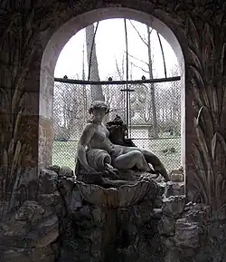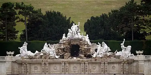 The Neptune Fountain at the foot of the Gloriette hill was designed to be the crowning monument of the Great Parterre.[41] Commissioned by Empress Maria Theresa, work on the fountain began in 1776 and was completed within four years, just prior to the death of the empress.[41] The overall design was done by Johann Ferdinand Hetzendorf von Hohenberg; the marble sculptural group was executed by Wilhelm Beyer.[41]