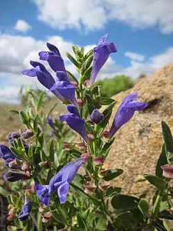 Scutellaria antirrhinoides is a species of flowering plant in the mint family[1] known by the common names nose skullcap and snapdragon skullcap. It is native to the western United States, where it grows in forests, woodlands, and open, rocky habitat types. It is a perennial herb producing an erect stem or cluster of stems up to 35 centimeters tall from a system of thin rhizomes. The stems are coated in short hairs which are curled or angled upward and sometimes have resin glands. The oval leaves are coated in tiny hairs and are oppositely arranged. The lowest leaves are borne on short petioles. Flowers emerge from the leaf axils. Each flower is held in a calyx of sepals with a large ridge or appendage on the upper part. The corolla measures up to 2 cm long, tubular in shape with a large upper and lower lip. The upper lip is folded into a beaklike protrusion and the lower has three flat lobes. The corolla is purple to blue[2] with an area of white mottling on the lower lip.