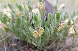Scutellaria nana is a species of flowering plant in the mint family known by the common names dwarf skullcap[1] and dwarf scullcap. It is native to the western United States, especially in and around the Great Basin. It grows in plateau scrub, often on volcanic soils.[2] It is a small perennial herb producing one or more erect stems up to about 20 centimeters tall from a rhizome. It is coated in tiny flat hairs which sometimes have resin glands. The leaves are oval or diamond-shaped, the lower ones borne on short petioles. Flowers occur in the leaf axils, each borne in a calyx of sepals with a prominent ridge on the upper surface. The corolla is up to 2 centimeters long, tubular in shape, and generally white or yellowish with purple mottling on the lips.
