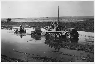 ![]() Sd.Kfz 10 halftrack towing a 7.5 cm Pak 40 anti-tank gun through mud | |