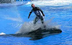Killer whale captivity is a widely debated topic. Regarding anatomy, captive killer whales can exhibit collapsed dorsal fins. However, this trait has been witnessed in the wild and a prominent theory proposes this phenomenon can occur when any orcas live in relatively warmer conditions. Though, since captive orcas are more likely to breach, rising up to warmer waters, captivity itself can increase the temperature in which these whales live. Some evidence has shown that the condition can manifest in individuals after a month in captivity.[46] Some argue that aggression among captive killer whales is common, whilst others claim that this also occurs in the wild. In August 1989, a dominant female killer whale, Kandu V, attempted to rake a newcomer whale, Corky II, with her mouth during a live show and smashed her head into a wall. Kandu V broke her jaw, which severed an artery, and then bled to death.[47] In November 2006, a dominant female killer whale, Kasatka, repeatedly dragged experienced trainer, Ken Peters, to the bottom of the stadium pool during a show after hearing her calf crying for her in the back pools.[48] In February 2010, an experienced female trainer at SeaWorld Orlando, Dawn Brancheau, was killed by killer whale Tilikum shortly after a show in Shamu Stadium.[49] The whale had been associated with the deaths of two people previously.[47][50] In May 2012, administrative law judge Ken Welsch upheld two Occupational Safety and Health Administration citations after Dawn Brancheau's death, including one directly related to her death, and fined the company a total of $12,000.[51] Trainers were banned from making close contact with the whales.[52] In April 2014 the US Court of Appeals for the District of Columbia denied an appeal by SeaWorld.[53] On December 22, 2015, an 18-year old SeaWorld orca, Unna, died from a fungal infection at the SeaWorld Park in San Antonio, Texas.[54]