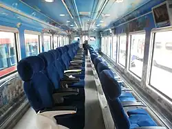 The train has four cars, three of them with seats that face the windows, for a full ocean-view and the fourth car has family seats where passengers can face each other.[2] The interior walls are painted in ocean-blue colors to simulate an undersea world. Activities on the train include talks on the Gangneung and Samcheok regions, and music, including passenger requests via text message, and a marriage proposal room.[5][7]