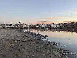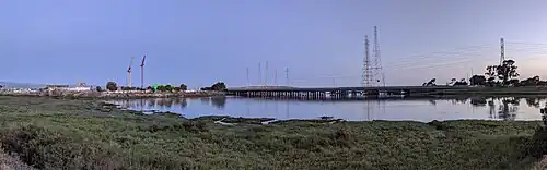 The mouth is characterized by a marshy area and an extent of bay mud extending approximately 700 m (2,300 ft) northward into San Francisco Bay. The mouth is crossed by the Seal Slough Bridge carrying East Third Avenue / J Hart Clinton Drive, completed in 1985,[11] and a narrower, older bridge previously used by the road and now part of the San Francisco Bay Trail. Seal Slough is separated from Marina Lagoon by a small earthen dam, which has tidal gates at the south end, and gravity or pumped flow at the north end.[12]: 17 Near the downstream / northern end of Marina Lagoon is situated the city of San Mateo Wastewater Treatment Plant, Bayside School, and Bayside/Joinville Park on the western/southern bank; on the northern/eastern bank is the Mariner's Island residential development. In between, a small island near the dam, accessible by boat, is preserved as Lagoon Island Park.