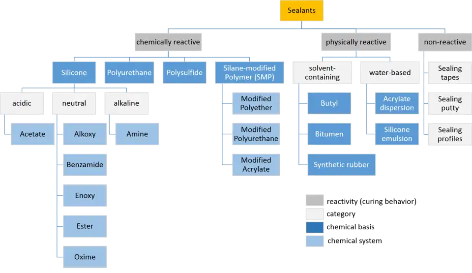 Sealants can be categorized in accordance with varying criteria, e. g. in accordance with the reactivity of the product in the ready-to-use condition or on the basis of its mechanical behavior after installation.[9]