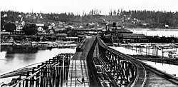 The most difficult part of building the line was the trestle ran south from the King Street Coal Wharf, carrying trains through the tide flats that would later be filled to form Seattle's Industrial District. Joe Surber sunk numerous piles into the flats, using his pile driver. The resulting trestle was short-lived, though: shipworms attacked the pilings, and this portion of the line had to be replaced by the successor Columbia and Puget Sound Railroad less than five years after it was initially built.[16]