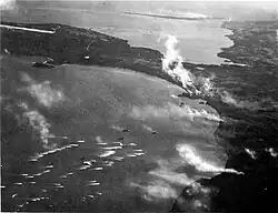 One consequence of the postponement of W-Day was that it permitted a prolonged air and sea preliminary bombardment, which turned out to be the longest of any island in the Pacific during the war. On 8 July, Rear Admiral C. Turner Joy re-commenced the bombardment with four heavy cruisers, twelve destroyers and the escort carriers USS Corregidor and USS Coral Sea, in coordination with carrier aircraft from Task Force 58. The main targets were coastal defense and anti-aircraft guns, followed by communications, command posts, warehouses and troop concentrations. Over the following days, the battleships USS New Mexico, Pennsylvania, Idaho, Colorado, California and Tennessee joined in.[62][63]