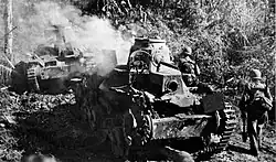 A tank dozer and tank crews of the 22nd Tank Company with picks and shovels constructed a causeway over the Ayuja River, allowing tanks to cross, but when the 22nd Marines attempted to advance across the rice paddies at the base of the Orote Peninsula on 23 July they were pinned down under mortar and small arms fire. Tanks became bogged in the soft mud of the rice paddies, but when they tried to use the road, one was disabled by 37 mm anti-tank gun fire and another by a mine.[110][111]