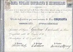 In 1883, the di Nocera family also established one of the first Italian banche popolari (cooperative banks), headquartered in Secondigliano, to combat usury and provide further stimulus to the local economy.[22][23]