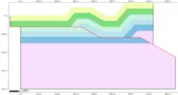 The earliest attempts to produce restored sections were on foreland fold and thrust belts.[2] This technique assumed a stratigraphic template with unit thicknesses either constant or smoothly varying across the section. Line lengths were measured on the present-day deformed section and transferred to the template, to rebuild the section as it was before deformation started. This method does not guarantee that area is conserved, only line length. The technique was applied to areas of extensional tectonics initially using vertical simple shear.[3][4] Over the next decade several types of commercial restoration software became available, allowing the technique to be routinely applied.