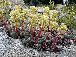 Sedum oregonense is a species of flowering plant in the family Crassulaceae known by the common name cream stonecrop.[1] It is native to the Klamath Ranges of southern Oregon and northern California, where it grows in rocky habitat. It is a succulent plant forming basal rosettes of leaves up to about 4 centimeters long. Smaller leaves occur higher up the stem. The leaves are green in color and waxy in texture. The inflorescence is an upright, wide open array of flowers. The flowers have yellow petals with red-tinged or white-speckled undersides.