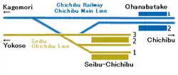 Seibu-Chichibu Station is the terminus station of the Seibu Chichibu Line, and is located 19.0 km from the opposing terminus of then line at Agano.[1] Some Seibu trains continue to Mitsumineguchi Station on the Chichibu Main Line of Chichibu Railway via a crossover between the two lines. Some Seibu trains also run to Nagatoro Station in the opposite direction of the Chichibu Main Line, however those trains do not stop at Seibu-Chichibu Station due to the layout of the crossover track.