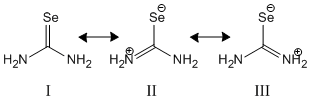 Both the shortened length of the N−C bond and the longer Se=C bond suggest a delocalization of the lone pair on the amines; the Se=C π-bonding electrons are drawn towards the selenium atom, while the nitrogen's lone pair is drawn towards the carbonyl carbon. A similar effect is observed in urea and thiourea. In going from urea to thiourea to selenourea the double bond is more delocalized and longer, while the C−N σ bond is stronger and shorter. In terms of resonance structures, the selenol form (structures II, III) is more prevalent compared to urea and thiourea analogs; however, the lone pair the nitrogen of selenourea delocalizes only slightly more than the lone pair on thiourea (in contrast to a much greater delocalization in going from urea to thiourea).[6] These minor differences suggest that the properties emergent from the delocalized nitrogen lone pair and destabilization of the C=S and C=Se π bond in thiourea and selenourea will also be similar.