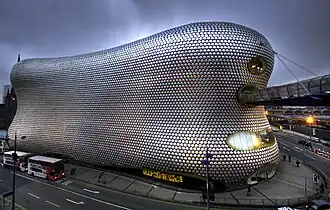 The architecture firm Future Systems were appointed by Selfridge's then chief executive, Vittorio Radice, to design only the third store outside London. Although Selfridges was physically integrated with the Bullring Shopping Centre the client wanted a distinct design approach which would set the store apart from the rest of the development and become an instantly recognisable signpost for the brand.[1] The building's facade is curved, wrapping around the corner of Moor Street and Park Street. The facade comprises 15,000 anodised aluminium discs mounted on a blue background.