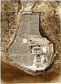 The Hippodamian urban plan dates to the fourth century BC (i.e. to the period of Punic rule) and is divided in quarters by two main streets (9 metres wide), which cross at right angles (the north–south road is 425 metres long, the east–west is 338 metres long). Every 32 metres they are intersected by other minor roads (5 metres wide).