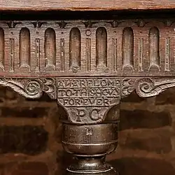 Laurence Cadbury was George Cadbury's fourth son, and the collection at Selly Manor is a testament to his interest in collecting fascinating items. Laurence began collecting objects whilst studying at Cambridge in about 1908 and continued well into the mid-1930s.[7] Much of his collection was displayed at his house, The Davids in Northfield, Birmingham, but Selly Manor was a perfect home for the 16th and 17th century furniture and domestic objects he loved so much. From sturdy oak chests and intricate carvings to a beautiful tapestry and unusual utensils, there is so much to appreciate. The highlight of the collection is an 18-foot table dating from the 1630s which was originally from the now demolished Crooke Hall in Lancashire.[7]