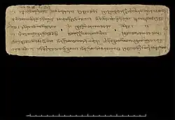 While the terms "Mind Section" (Tib. sems sde) and "Mind Orientation" (Tib. sems phyogs) are not attested prior to the 11th century (and are thus not found in the earliest Dzogchen texts), they are used by Tibetan and Western scholars retroactively to refer to a class of texts.[1] The most of important of these are the "Eighteen Great Scriptures" (Lung-chen bco-brgyad), which came be to called "mind series" (sems de) texts at a later date.[3] Five of these texts, the "five early translations" (snga ’gyur nga), are perhaps the earliest of these, and are attributed to the monk Vairotsana of Pagor.[19] Manuscripts of some of these texts have been found in the Dunhuang caves.[20] They include The Cuckoo of Awareness (Rig pa'i khu byug), The Small Hidden Grain (gSangs rgyas sbas pa), Questions and Answers of Vajrasattva and Gold Refined from Ore (rdo la gser zhun).[21] According to Liljenberg, Gold Refined from Ore may be the earliest of these and could indeed have been written in India.[22]