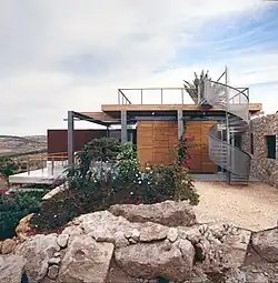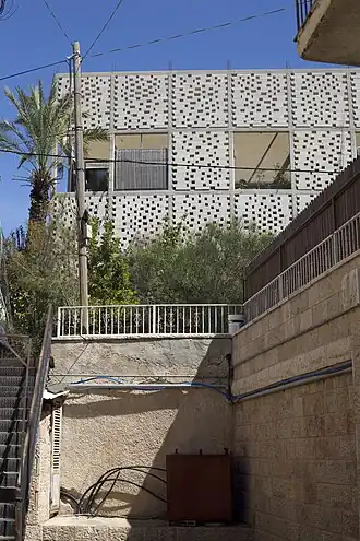 Al-Mashrabiya Building, located in Southern Jerusalem, is a residential and commercial building. Abdelqader described the building as “a contemporary reinterpretation of traditional elements of Arab vernacular architecture”.[15] Like many of his projects, al-Mashrabiya Building carries with it political, social, economic and environmental critique of what he perceives as oppressive and out of context planning policies on the one hand, and conservative, romantic traditionalism on the other.[16][17][18]