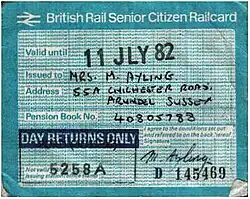 During the early 1970s, some of British Rail's Regions offered a series of small, localised travel promotions for people of or near retirement age. The London Midland and Southern regions were particularly active in this, although other examples existed elsewhere.[1] These promotions were characterised by restricted validity and geographical availability. For example, one Southern Region scheme introduced in 1970 offered pensioners half-price travel at off-peak times on Tuesdays, Wednesdays and Thursdays only, for journeys from a set list of around twenty stations, upon production of their pension book (to confirm their eligibility).[2]