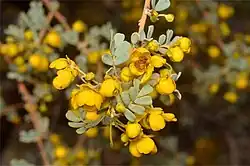 Subspecies cardiosperma is an erect shrub up to 2 m (6 ft 7 in) high and has pinnate leaves 5–10 mm (0.20–0.39 in) long on a cylindrical petiole about 2 mm (0.079 in) long, with two to four pairs of linear to narrowly spoon-shaped leaflets 8–15 mm (0.31–0.59 in) long and 1–3 mm (0.039–0.118 in) wide. There is a single sessile gland between the lowest pair of leaflets, and a stipule at the base of the leaf, but that falls off as the leaf opens. The flowers are yellow and arranged in upper leaf axils in pairs or groups of up to four on a peduncle 3–5 mm (0.12–0.20 in) long, each flower on a pedicel 5–10 mm (0.20–0.39 in) long. The petals are 4–6 mm (0.16–0.24 in) long and there are ten fertile stamens, the filaments 1–2 mm (0.039–0.079 in) long. Flowering occurs in winter and spring, and the fruit is a flattened, straight pod 20–50 mm (0.79–1.97 in) long.[3][2]