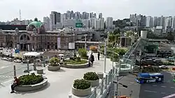 The disused overpass closed in 2015 and cuts diagonally across Seoul Station at 17 metres (56 ft) above street level.[3] The "70" in the name comes from 1970, the year the flyover was dedicated, while the "17" is a reference to both the number of walkways connected to it and its opening in 2017.[4] The park includes gardens, terraces, and exhibitions, and was promised to "feature over 24,085 plants representing 228 species of trees, shrubs and flowers found in and outside Korea."[5]