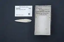 Sepia braggi is a relatively small species of cuttlefish. Females of the species are larger than males and they grow to a mantle length of 80 mm and 49 mm, respectively.[7] The mantle elongates to 3 times longer than it is wide. The mantle is cigar-shaped and triangular towards the anterior end.[8] Narrow fins extend along the lateral margin of the mantle and widen along the posterior. The head is short and narrower than the mantle.[6] The cuttlebone tends to have a similar length to the mantle.[9] The common name of S. braggi originates from its slender cuttlebone, which is lanceolate in shape.[6] The tentacular club is relatively short, with five rows of suckers.[10] The suckers are all approximately the same size except for 5 or 6 suckers in the middle row which are 2 to 3 times larger. The suckers on the arms are dispersed and minute in size.[8] The arms of the males are large compared to the females, with 35.2 mm to 57.8 mm in length, while the arms of the female range from 30.6 mm to 39.6 mm in length.[6] In contrast to similar species, the hectocotylus is absent.[6] This cuttlefish can also be identified by its beak, which is useful for examining the stomachs of fish.[11] Of the Sepia genus, S. braggi is only species that does not have a darkened lateral band on the upper and lower beak. Also, on the upper beak, the fully darkened section is much smaller (2.6 mm) than other species of Sepia.