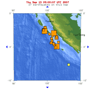 Aftershocks continued into 13 September and 14 September, with more earthquakes ranging up to magnitude 6.4.[5] Most of the aftershocks have been northwest of the original magnitude 8.4 earthquake. A 6.7 struck Southern Sumatra on Sept 20, 2007.