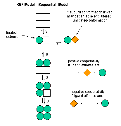 The KNF model (or induced fit model or sequential model) arose to address the possibility of differential binding states.[5] Developed by Koshland, Némethy and Filmer in 1966, the KNF model describes cooperativity as a sequential process, where ligand binding alters the conformation, and thus the affinity, of proximal subunits of the protein, resulting in several different conformations that have varying affinities for a given ligand. This model suggests that the MWC model oversimplifies cooperativity in that it does not account for conformational changes of individual binding sites, opting instead to suggest a single, whole-protein conformational change.[4]