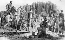 The earliest surviving record of an epic poem related to Serbian epic poetry is a ten verse fragment of a bugarštica song from 1497 in Southern Italy about the imprisonment of Sibinjanin Janko (John Hunyadi) by Đurađ Branković,[3][4] however the regional origin and ethnic identity of its Slavic performers remains a matter of scholarly dispute.[5][6] From at least the Ottoman period up until the present day, Serbian epic poetry was sung accompanied by the gusle and there are historical references to Serb performers playing the gusle at the Polish–Lithuanian royal courts in the 16th and 17th centuries, and later on in Ukraine and Hungary.[7] Hungarian historian Sebestyén Tinódi wrote in 1554 that "there are many gusle players here in Hungary, but none is better at the Serbian style than Dimitrije Karaman", and described Karaman's performance to Turkish lord Uluman in 1551 in Lipova: the guslar would hold the gusle between his knees and go into a highly emotional artistic performance with a sad and dedicated expression on his face.[8] Chronicler and poet Maciej Stryjkowski (1547–1582) included a verse mentions the Serbs singing heroic songs about ancestors fighting the Turks in his 1582 chronicle.[9] Józef Bartłomiej Zimorowic used the phrase "to sing to the Serbian gusle" in his 1663 idyll Śpiewacy (Singers).[9]