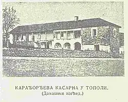 The first foot drill (egzercir) began in 1804 by the troops besieging Belgrade.[20] The army trained in the nahija and camps, with Karađorđe being known to have personally watched over exercises in Topola, the most important centre for training and military reserve from where units were dispatched.[25] The military training was conducted initially according to Austrian routines as the first instructors (Serbian: egzercir-majstori) either came from the Military Frontier or were local veterans of the Free Corps.[26] In the leadership, Free Corps veterans included Karađorđe, Sima Marković, Miloje Todorović, among others.[15] Austrian influence was evident also in the names of officer ranks.[26] With the Russian-Serbian alliance and arrival of Russian troops in 1807, the training was conducted according to Russian routines.[26] For a period following this, there were two military training divisions in Serbia, one in the east, where the rebels fought alongside the Russians and had many of their officers among their ranks, and one in the west, where there were Austrian instructors and proximity to Austrian borders, however, by the end, the Russian principle prevailed.[27] The first regulations of training were implemented with the establishment of the regular battalion in 1808, while the second regulations came in 1813 and included pictures of uniforms, further regulations were written the same year in the Military Code (Serbian: Военнии устав, Војни устав) by the captain of regular troops Jakov Jakšić according to Russian principle.[26]