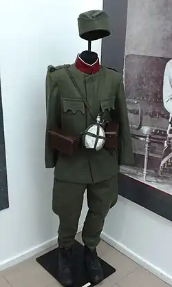 Because of the poor financial state of the Serbian economy and losses in the recent Balkan Wars, the Serbian army lacked much of the modern weaponry and equipment necessary to engage in combat with their larger and wealthier adversaries. Only 180,000 modern rifles were available for the operational army, which meant that the Serbian military lacked between one-quarter to one-third of the rifles necessary to fully equip even their front-line units, let alone reserve forces.[26] Although Serbia tried to remedy this deficit by ordering 120,000 rifles from Russia in 1914, the weapons did not begin to arrive until the second half of August. Only 1st ban troops had complete grey-green M1908 uniforms, with 2nd ban troops often wearing the obsolete dark blue M1896 issue, and the 3rd ban had no proper uniforms at all and were reduced to wearing their civilian clothes with military greatcoats and caps.[27] The Serbian troops did not have service issued boots at all, and the vast majority of them wore everyday footwear made of pig skin called opanak.