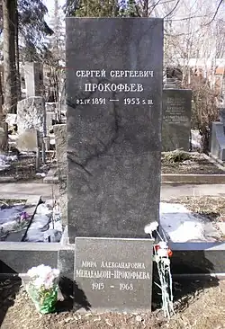 Prokofiev's wife Mira Mendelson spent her final years living in the Moscow apartment they had shared.[155] She occupied her time organizing her husband's papers, promoting his music, and writing her memoirs, having been strongly encouraged by Prokofiev to embark on the latter. Work on the memoirs was difficult for her; she left them incomplete at her death.[156] Mendelson died of a heart attack in Moscow in 1968, 15 years after Prokofiev.[157] Inside her purse a message dated February 1950 and signed by Prokofiev and Mendelson instructed: "We wish to be buried next to each other." Their remains are buried together at Novodevichy Cemetery.[158]