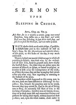 In this sermon, Swift criticises a "decay" in preaching that has led to people falling asleep in church.[66] Throughout the Sermon, Swift constantly relies on the Parable of the Sower.[49] Swift emphasises the wording of St. Matthew when he says, "whose Hearts are waxed gross, whose Ears are dulled of hearing, and whose eyes are closed," and he uses "eyes are closed" to connect back to those sleeping in Church.[49][65]