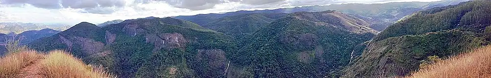 Cachoeirão, a waterfall located in the middle of the Serra dos Cocais mountains and the native Atlantic forest in contrast to surrounding eucalyptus plants. | |