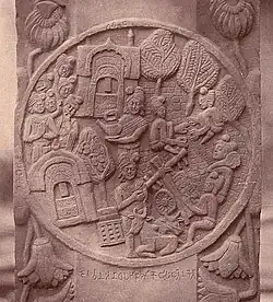 The setthi Bhutapala, from Vaijayanti, one of the main patrons of the Karla Caves, left an inscription among the sculpted decorations on the veranda of the Chaitya, mentioning his completion of the cave.[3][4] The completion of the cave mentioned by Bhutapala may refer to the ornate sculptures of the veranda, during the final phase of decoration.[5]